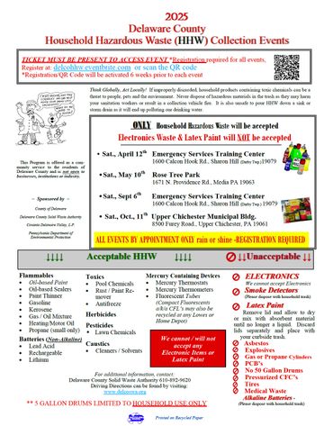 Delaware county holds 4 hazardous waste events each year (appointments required) and Delaware County residents can also register at regional HHW events. This program is NOT OPEN to businesses, institutions, or industry. CFL bulbs can be recycled at Lowes and Home Depot. Latex paint can be disposed of in trash after dry or solidified. Alkaline batteries can be recycled at Staples.