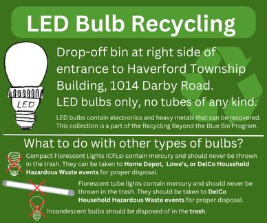 Haverford Township residents can recycle LED bulbs outside of the Township building, 1014 Darby Rd. The drop-off bin is located outside the building on the right-hand side of the main entrance. Yes to LED bulbs, No tubes any kind, No CFLs, No incandescent bulbs.