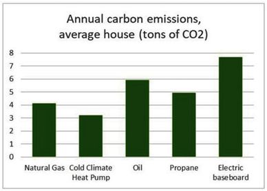 Heat Pumps provide both heating and cooling. They save on greenhouse gas emissions over oil, electric baseboard heating, natural gas, and propane. They are cheaper to operate than oil, electric baseboard, and propane. With 2021 PECO rates, heat pumps are more expensive to operate than natural gas. Image: neep.org